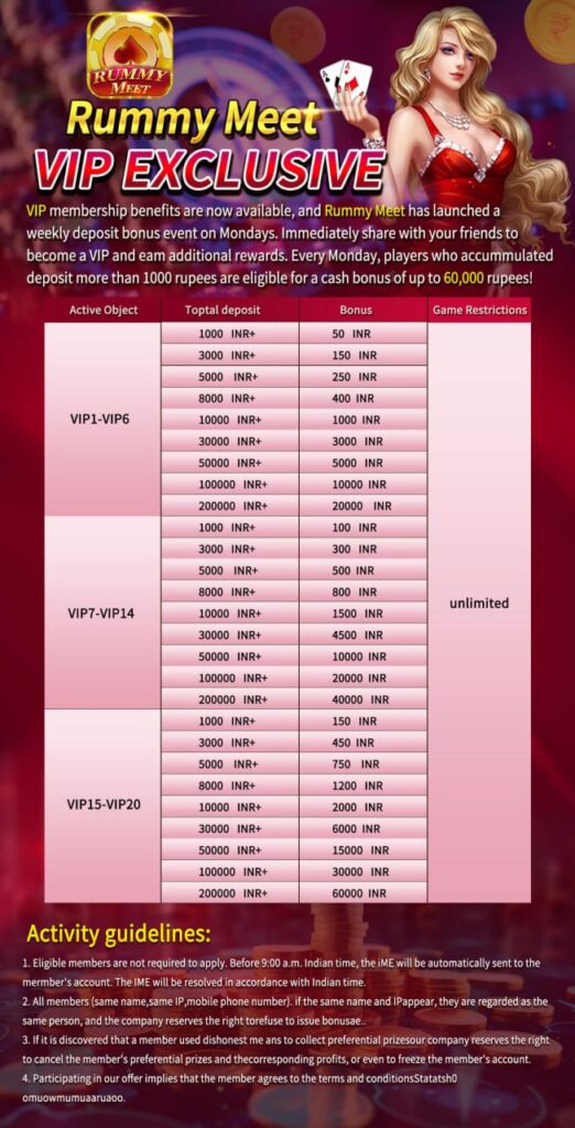 7. **Weekly Deposit Bonus Event**: Rummy Meet launches a weekly deposit bonus event every Monday.