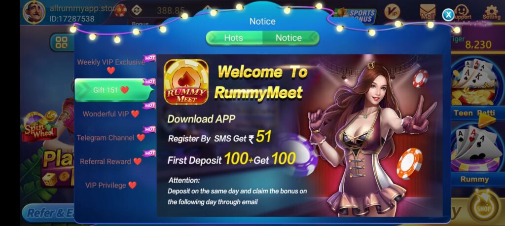 1. **Welcome Bonus**: Immerse yourself in Rummy Meet with a lucrative Rs. 51 signup bonus.