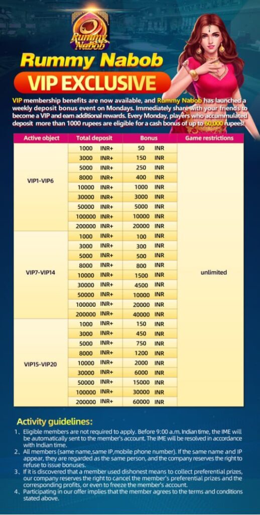 7. **Weekly Deposit Bonus Event**: Rummy Nabob launches a weekly deposit bonus event every Monday.