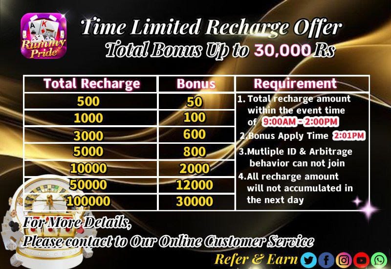 7. Exclusive Time-Limited Bonus: From 9:00 am to 2:00 pm, seize the opportunity to receive a bonus on recharge amounts ranging from 500 INR to 100,000 INR. After 2:01 pm, unlock an additional 20% bonus for added excitement.